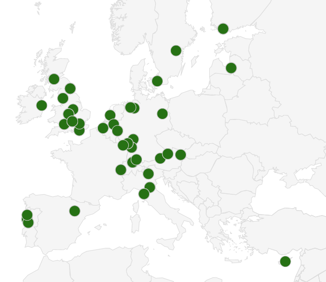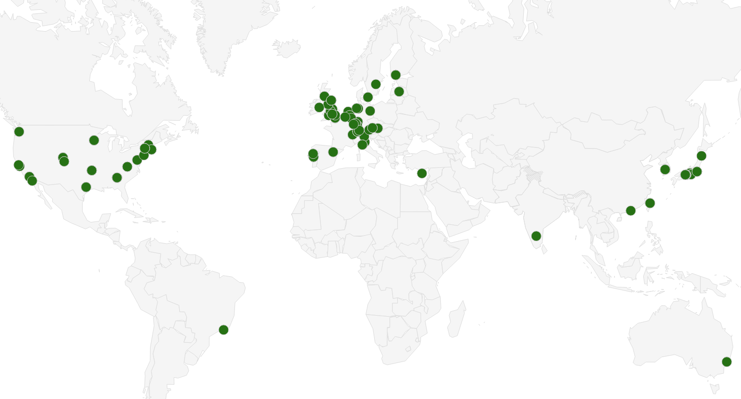 With 101 submissions (after a first sorting phase to weed out the incomplete and off-topic ones), we achieved an 8-year high for ISWC and continued the upward trend of the past years. The submissions were from all over the world, with quite a good balance between North-America, Europe, and Asia. From the latter, we've received a traditional high number of Japanese papers, and within North-America we've had this year a strong increase in submissions from the north-east. Although a large share of European submissions came from the United Kingdom and Germany, the spread is geographically really large. The maps below shows the locations where the submission authors come from (without counting the authors or submissions per location).