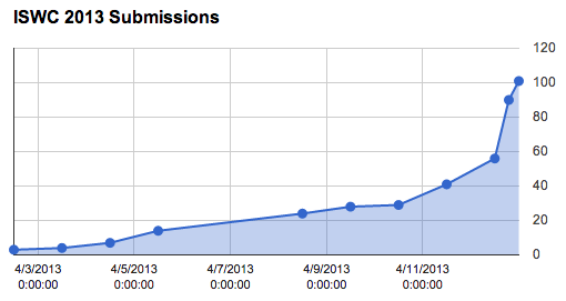 In total, we received 54 long papers (of maximally 8 pages), 34 notes (of maximally 4 pages), and 13 posters. In the next weeks, these will all be reviewed by at least two members of our program committee and at least 2 experts outside the program committee. The decisions about which of these submissions are accepted for presentation at ISWC 2013 will be discussed at a physical program committee meeting on the 13th of May, 2013. Another strong tradition of ISWC is that we assign to a large number of accepted papers a shepherd, to ensure that the changes that were suggested by the reviewers are properly incorporated in the final versions. These will be due by June 17th, 2013, so that they can be published in time by ACM.